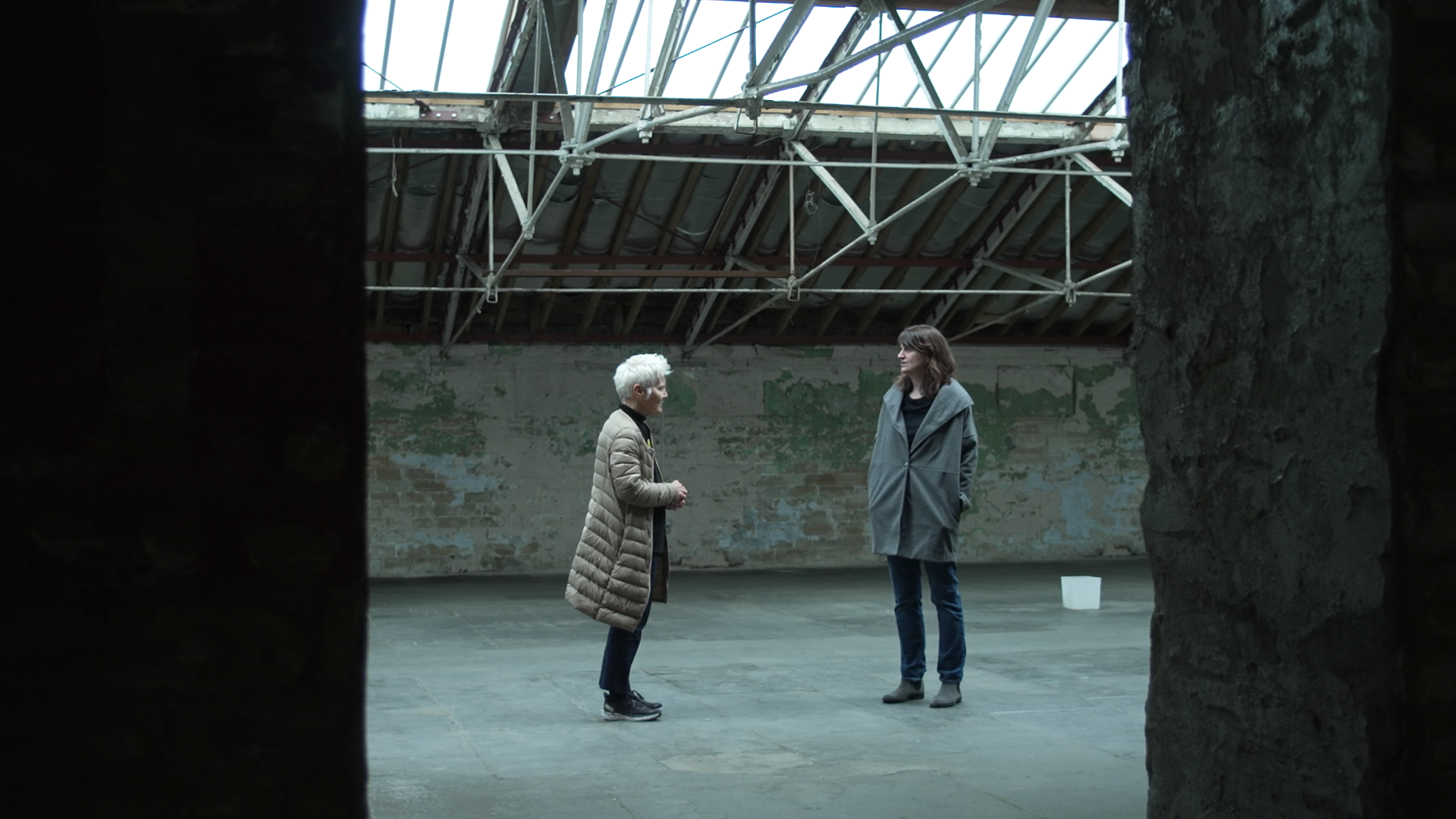 Two of the roof spaces resonate with sound, created by Hamilton with vocalist Emily Eagen. In the former spinning room, once filled with the deafening sound of machinery, we hear Eagen’s improvisational humming, whistling and singing of a 13th-century English folk song projected from the mill’s original revolving horn speakers. On the canal side of the mill, vinyl records play a ‘song for the future’ jointly composed from recordings made with the local community during workshops and at with Heaton St Barnabas’ C of E Primary School, Titus Salt School, Heaton St Barnabas Armchair Aerobics Group and Friends, Song-Geet, and See and Know Toddler Group at St Peter’s, Shipley.